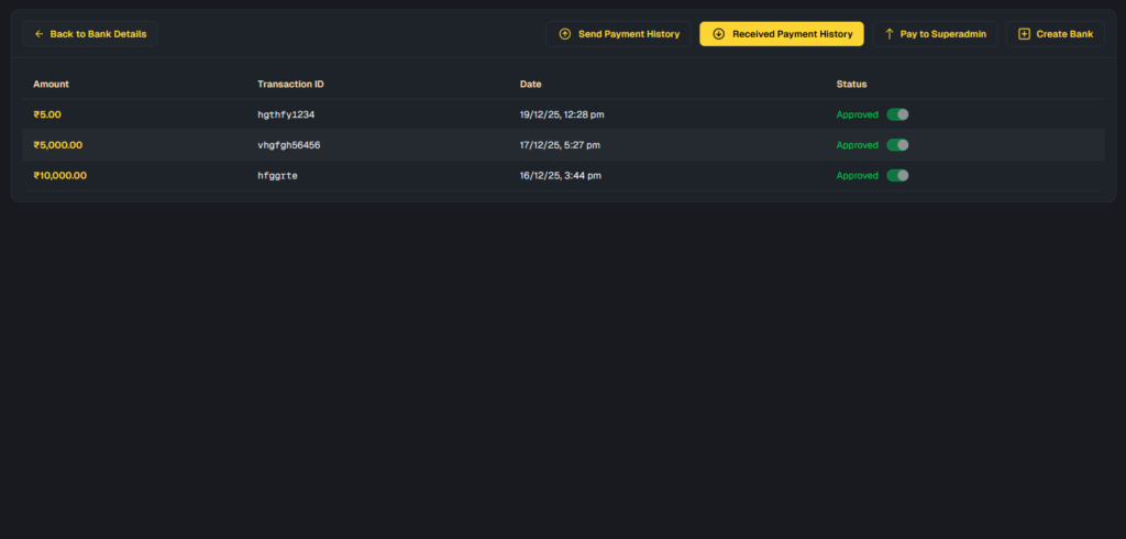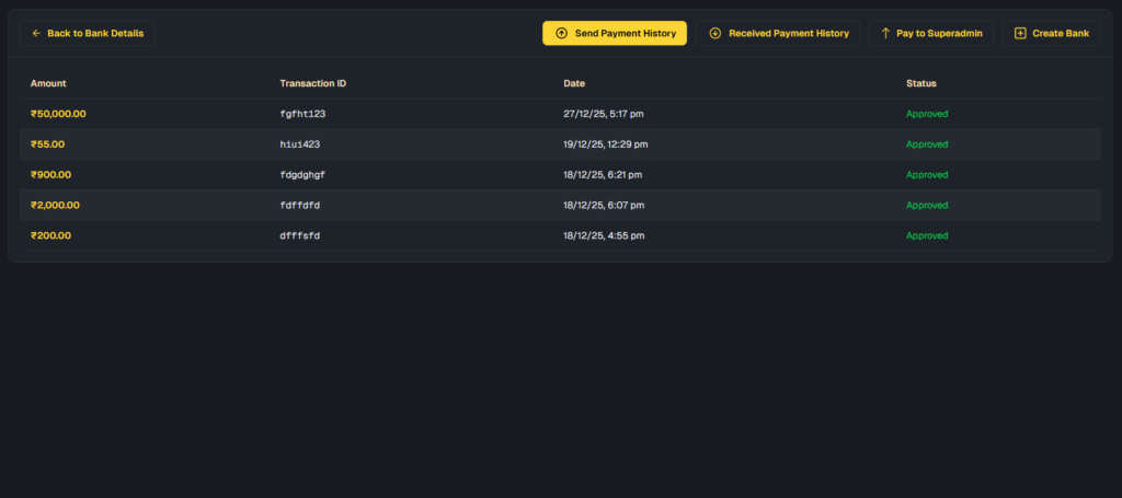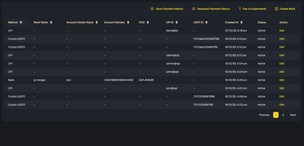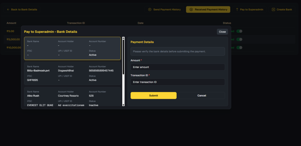 Bank details Estimated reading: 2 minutes 21 views Create Bank Add and configure multiple payout and payment methods, including Bank Transfers, UPI, Cash, and Crypto. This page allows for the seamless integration of financial channels by capturing essential details like account numbers, IFSC codes, and holder information, ensuring streamlined fund routing and transaction accuracy. Payment History This section allows users to manage payment methods and banking details used for sending and receiving funds. Users can add, view, edit, and track different payment options such as UPI, Bank Accounts, and Crypto (USDT). Send Payment History The Send Payment History section displays a complete record of all outgoing payments made from your account. It helps users track transaction amounts, reference IDs, approval status, and payment dates in a transparent and organized manner. Received Payment History The Received Payment History section displays a detailed record of all incoming payments received into your account. It enables users to monitor credited amounts, verify transaction references, and track approval status in a structured and transparent manner. Pay to Upper Level This screen allows users to initiate a payment to the Upper level by selecting an available bank or payment method and submitting the transaction details. Users can review bank information, enter the payment amount, provide the transaction reference, and securely submit the payment for processing.