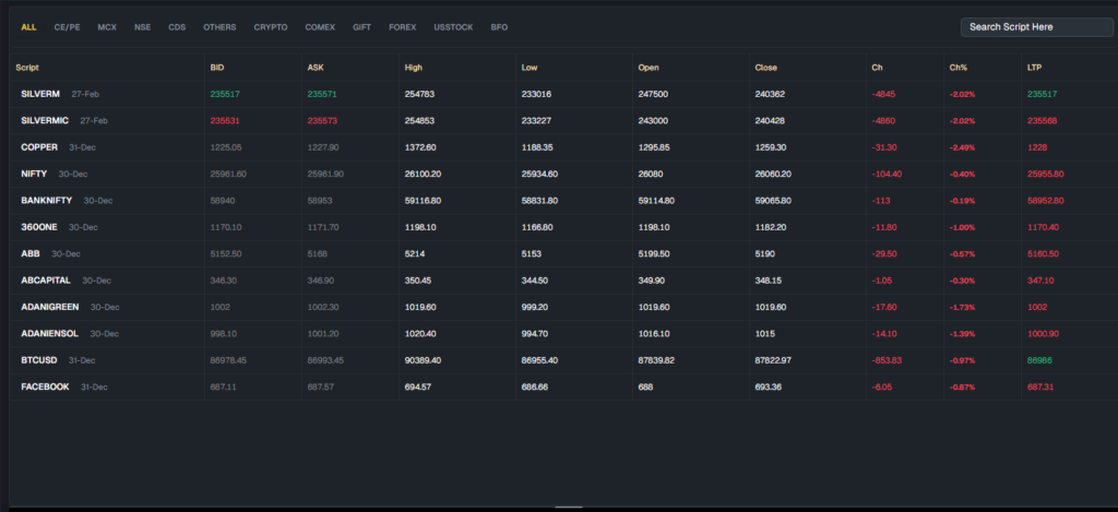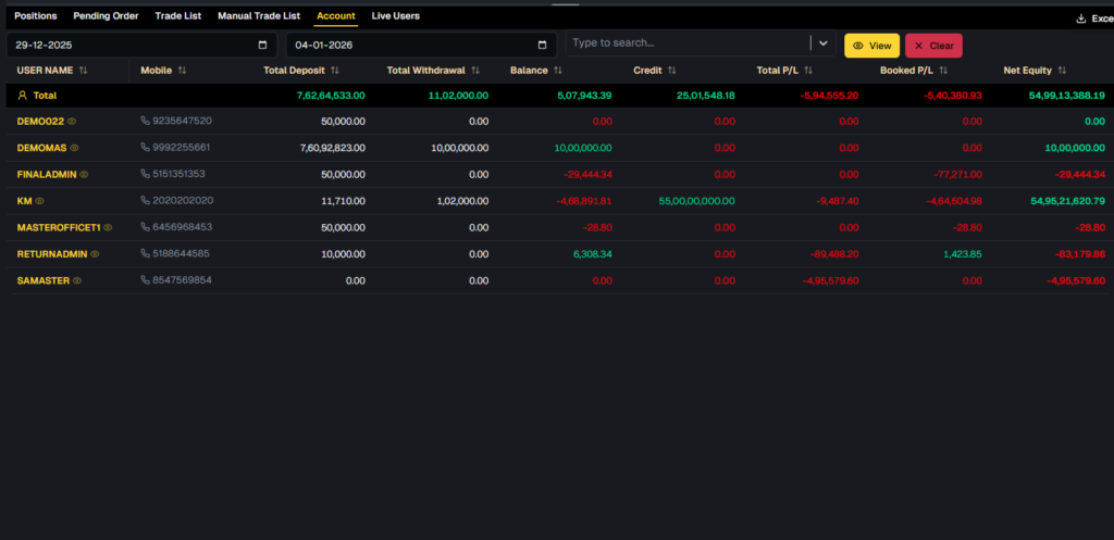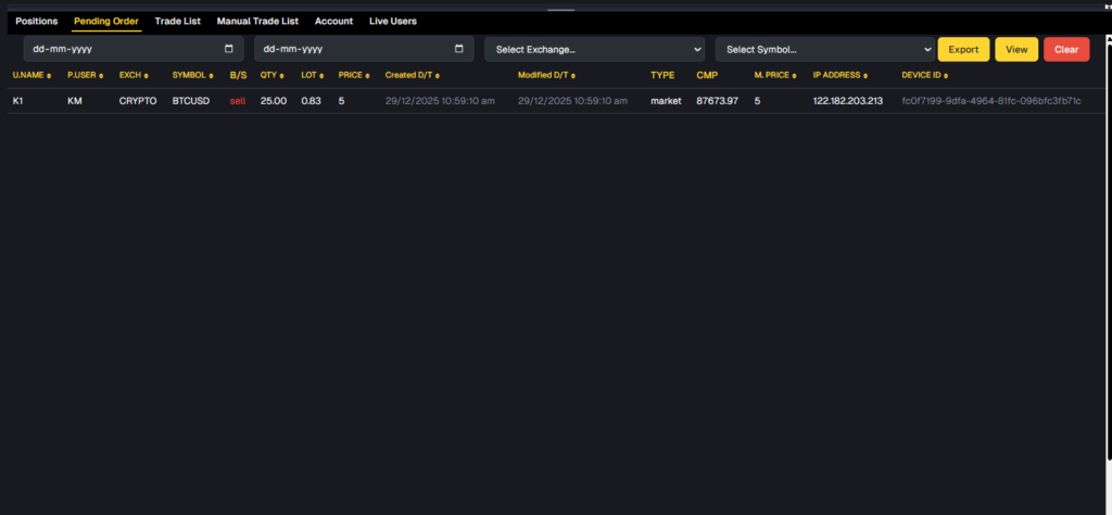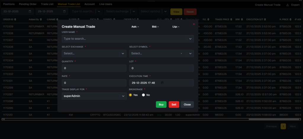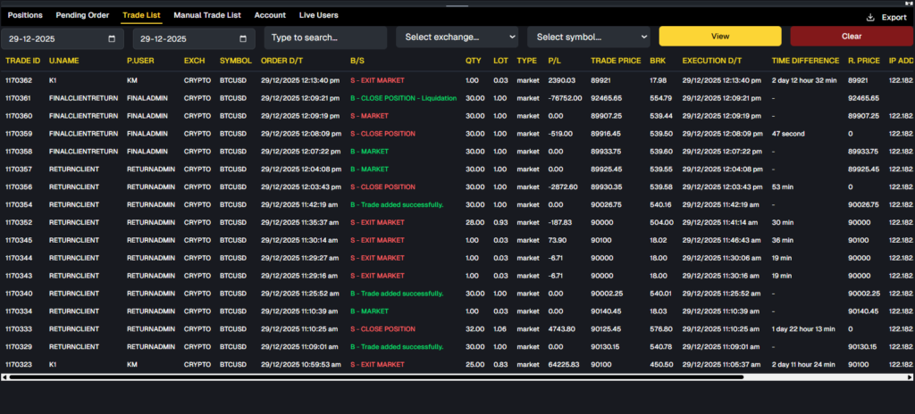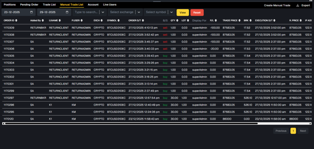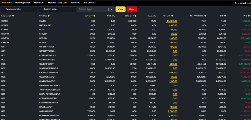 Dashborad Estimated reading: 2 minutes 48 views Watch List An all-in-one trading dashboard delivering live prices, detailed market insights, and comprehensive account controls. Built for speed, accuracy, and scalability to support modern trading operations. All Positions Monitor all your open positions in real time with complete transparency.Track Buy/Sell quantities, average prices, live P&L, and net exposure across markets from a single, powerful dashboard Pending Order The Pending Order section displays all orders that have been placed but are not yet fully executed. This screen allows users to monitor, filter, and manage pending trades in real time. Trade List Access a detailed, time-stamped record of all executed trades across exchanges and instruments.Includes order type, execution price, broker charges, device details, and audit-level tracking for full transparency. Create Manual Trade This screen allows authorized users to manually create and record trades for a selected user. It is typically used for adjustments, corrections, or offline executions where trades need to be entered directly into the system. Manual Trade List The Manual Trade List displays all trades that have been manually created within the selected date range. This screen helps administrators and operators review, filter, and audit manually entered trades in a structured tabular format. Account Get a consolidated overview of user financials, including deposits, withdrawals, balances, credit limits, and realized P&L. This page provides clear insights into account health, net equity, and overall financial exposure for effective account management.