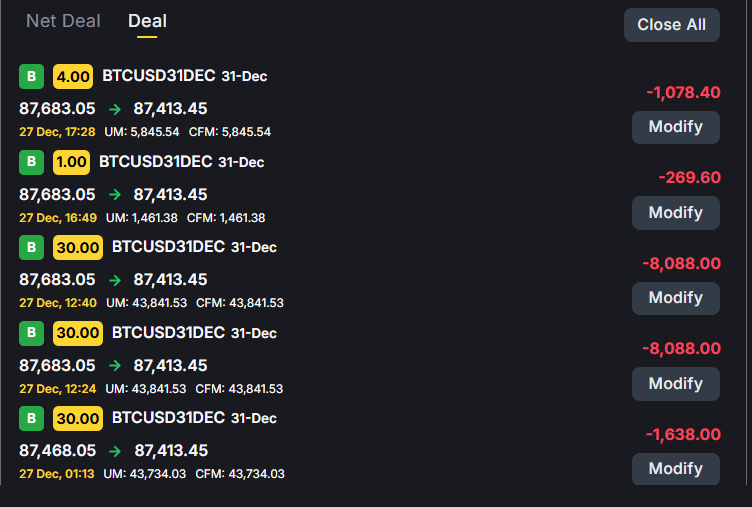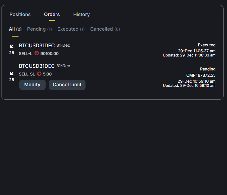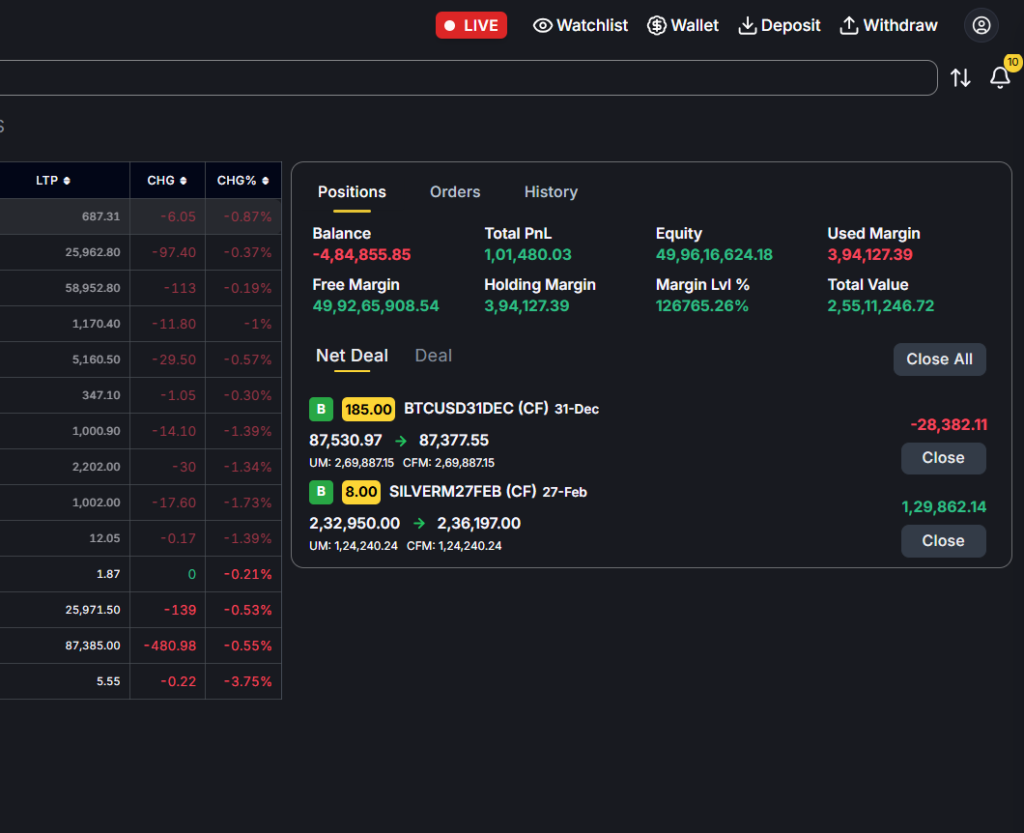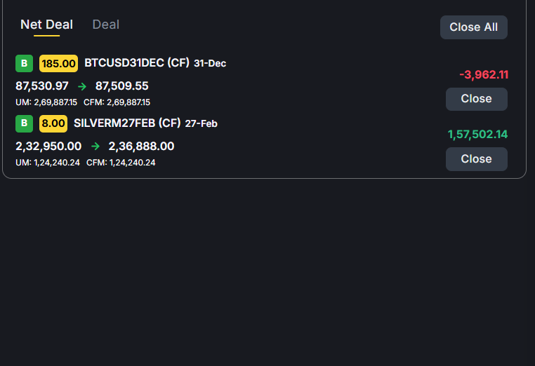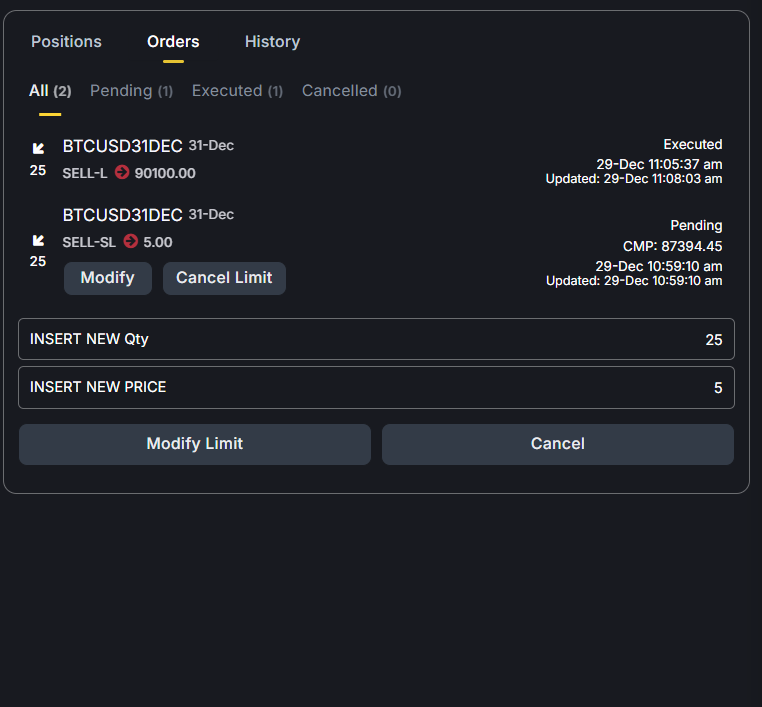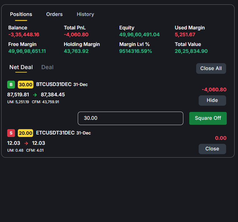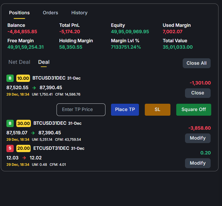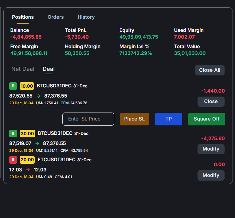 Trades Estimated reading: 3 minutes 14 views Your Position Monitor all open and closed trades in real time to manage your market exposure. This page provides a live snapshot of your portfolio, including current pricing and P&L, allowing for rapid decision-making and precise risk control. Net Deal wise This screen displays the Net Deal view, summarizing all open positions with their current profit or loss. It allows users to monitor active trades and close them individually or all at once. Deals wise This screen shows the Deal tab, which provides a deal-wise breakdown of individual open trades for the same instrument. Unlike the Net Deal view, each trade is listed separately with its own quantity, margin, and profit/loss. Your Orders This screen displays the Orders section, where users can track the status of placed orders for a selected instrument. Orders are categorized by execution state and can be managed directly from this panel. Order Modification This screen allows you to modify an existing pending order for a selected symbol.This feature is used to adjust quantity or price of a pending stop-loss/limit order without placing a new order, enabling better risk and trade management. Modification By SL This screen shows open positions with a focus on Stop Loss (SL) management, allowing users to control risk on active trades.Stop Loss (SL) FunctionalityEnter SL Price: Users can manually input a stop-loss price for the selected position.Place SL: Applies the entered stop-loss to protect the position from further loss.Purpose: Automatically closes the trade when the market reaches the SL price, limiting downside risk. Modification By TP This screen highlights open positions with a focus on Take Profit (TP) management, enabling users to lock in profits automatically when the market reaches a target price.Take Profit (TP) FunctionalityEnter TP Price: Users can input the desired take-profit price for a selected position.Place TP: Sets the take-profit order at the entered price level.Purpose: Automatically closes the position when the market hits the TP price, securing profits without manual intervention. Squareoff Square Off in DealCloses the selected individual position only.You can square off a partial or full quantity of that specific deal.Other open deals in the same symbol remain unaffected.Useful when you want to manage or exit one entry at a time.Square Off in Net DealCloses the entire net position for the selected symbol.All buy and sell quantities for that symbol are squared off together.No partial selection—the full net quantity is exited in one action.Useful for a quick complete exit from the symbol.